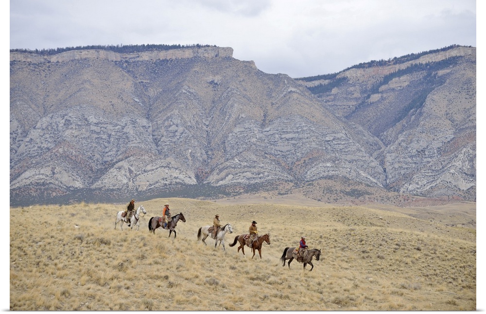 <p>Cowboys and Cowgirls riding horse in wilderness, Rocky Mountain, Wyoming</p>