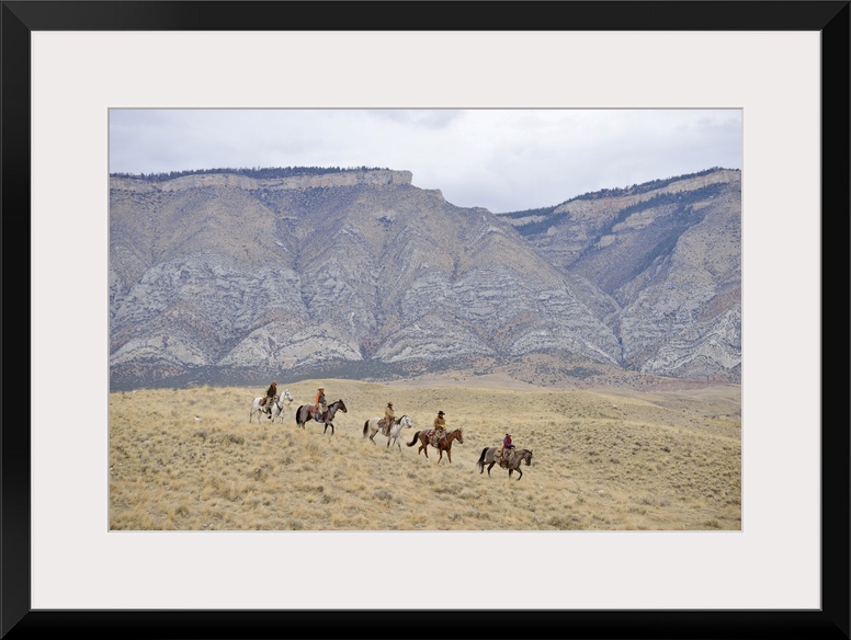 <p>Cowboys and Cowgirls riding horse in wilderness, Rocky Mountain, Wyoming</p>