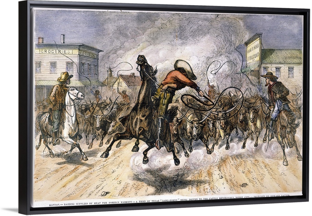 <p>Cowboys Driving A Herd Of Texas Longhorns To Market through the Streets Of Dodge City, Kansas, American Engraving, 1878.</p>