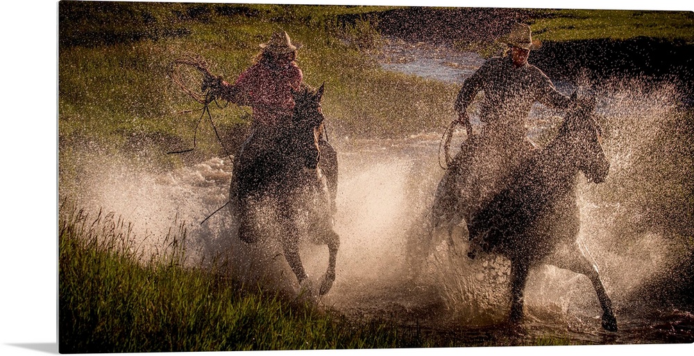 <p>Photograph of two cowgirls splashing through a steam on horseback with their lassos out.</p>