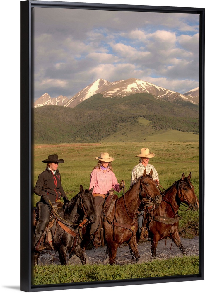 <p>Photograph of three cowgirls on horseback crossing a river.</p>