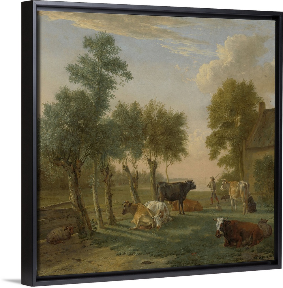 <p>Cows in a Meadow near a Farm, by Paulus Potter, 1653, Dutch painting, oil on canvas. The long shadows indicate a low sun, as the cows and sheep take their afternoon rest. There is a man with a rifle and dog, and a woman milking a cow.</p>