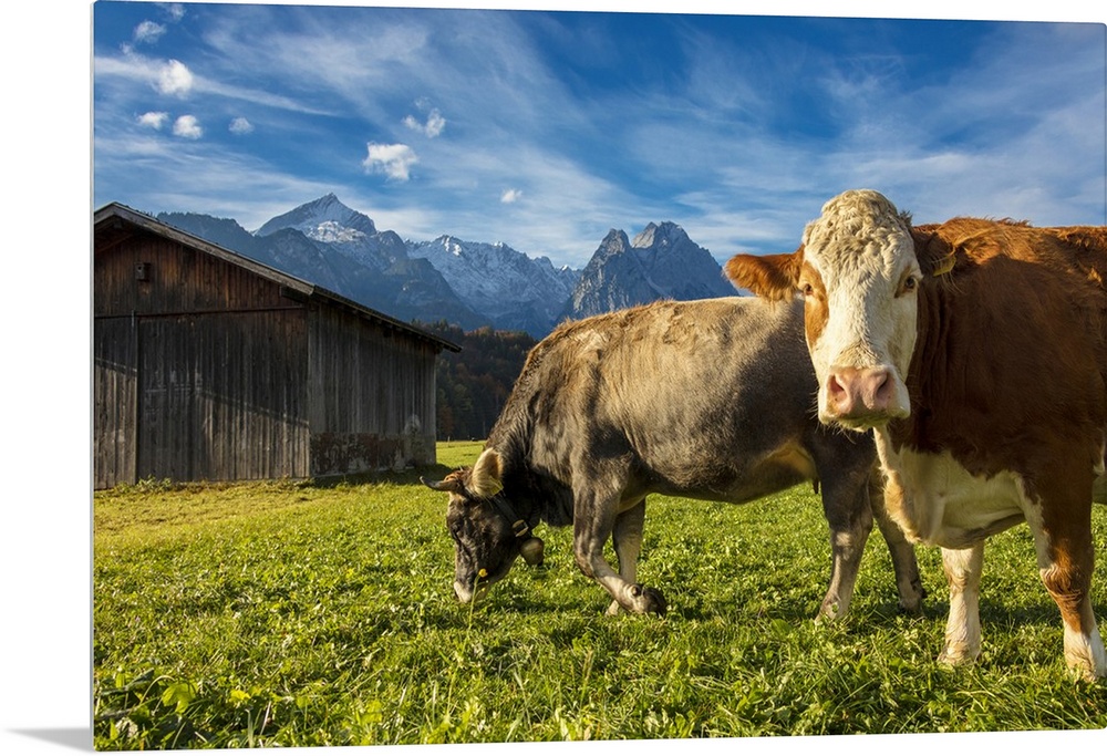 <p>Cows in the green pastures framed by the high peaks of the Alps, Garmisch Partenkirchen, Upper Bavaria, Germany</p>