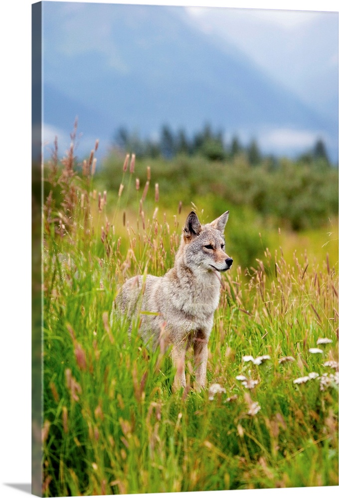 <p>coyote stands in summer flowers and grasses at the Alaska Wildlife Conservation Center, Southcentral Alaska</p>