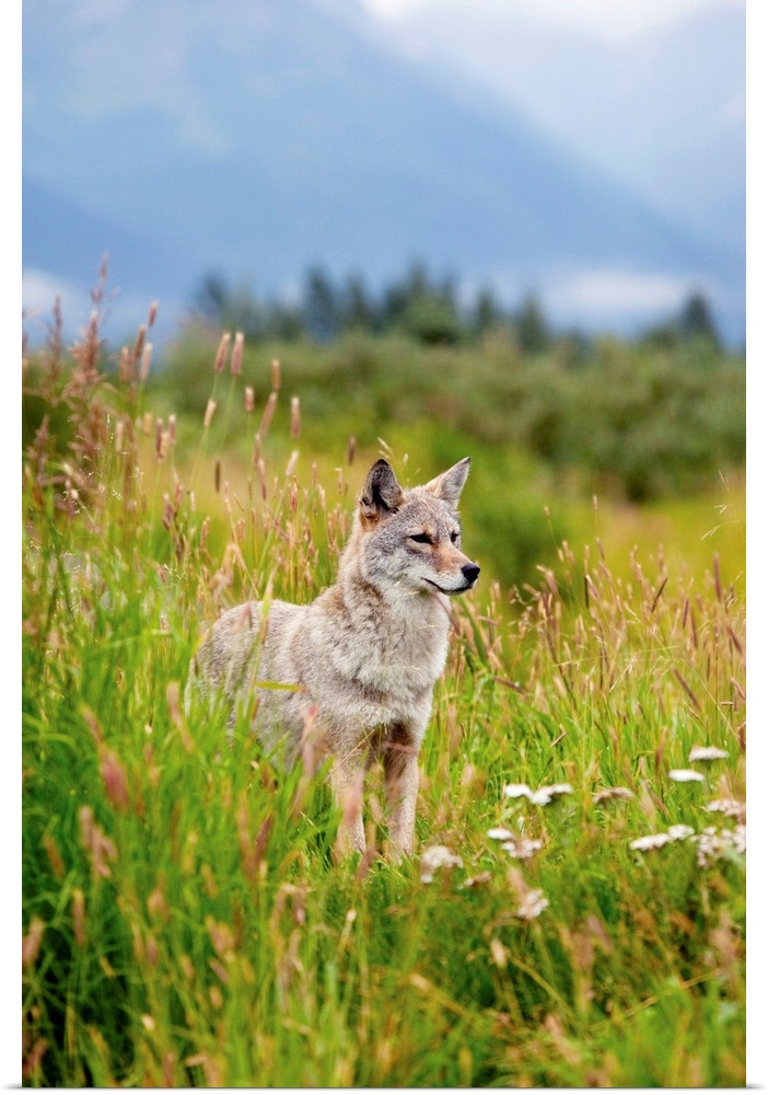 <p>coyote stands in summer flowers and grasses at the Alaska Wildlife Conservation Center, Southcentral Alaska</p>