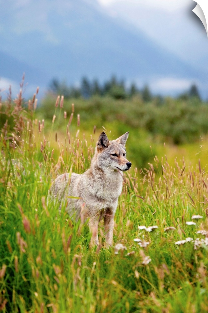 <p>coyote stands in summer flowers and grasses at the Alaska Wildlife Conservation Center, Southcentral Alaska</p>
