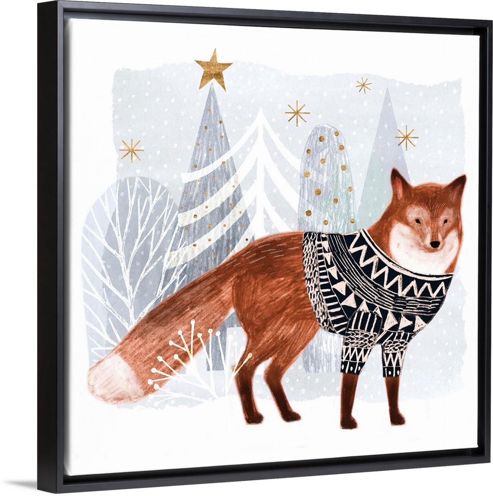 <p>A festive fox with soft chalk edges wears a cozy sweater against a winter wonderland landscape.</p>