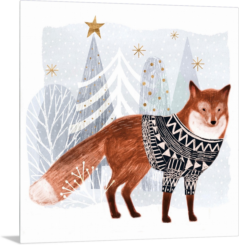 <p>A festive fox with soft chalk edges wears a cozy sweater against a winter wonderland landscape.</p>