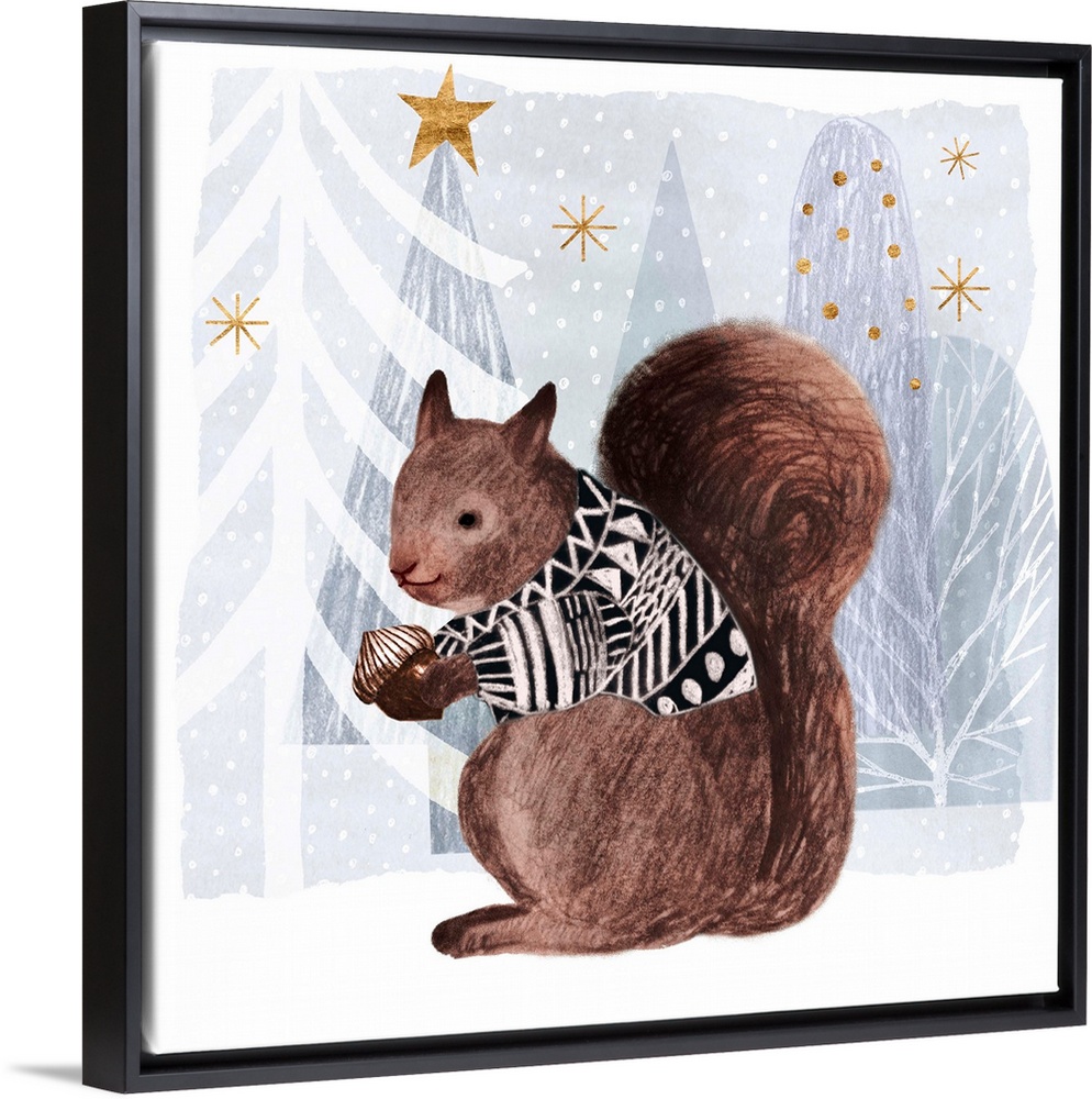 <p>A festive squirrel with soft chalk edges wears a cozy sweater against a winter wonderland landscape.</p>