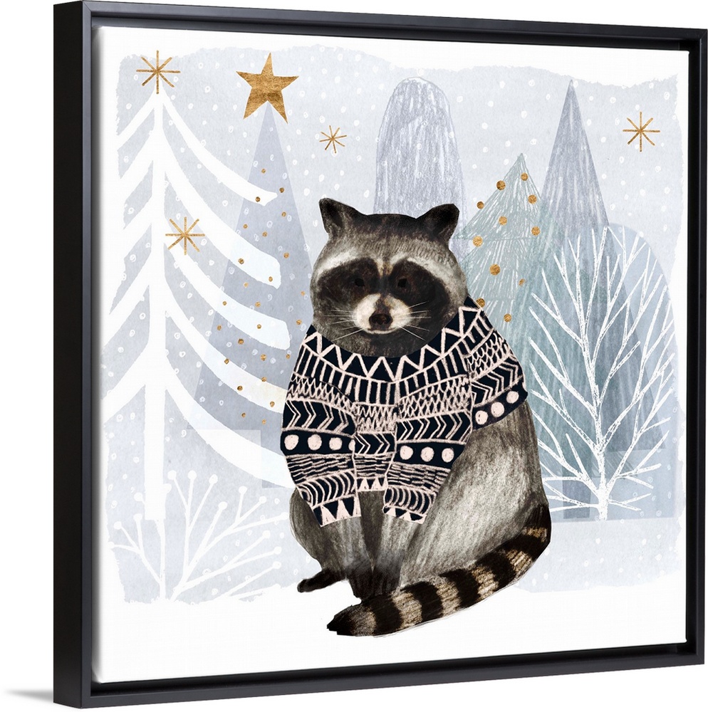 <p>A festive raccoon wears a cozy sweater against a winter wonderland landscape.</p>