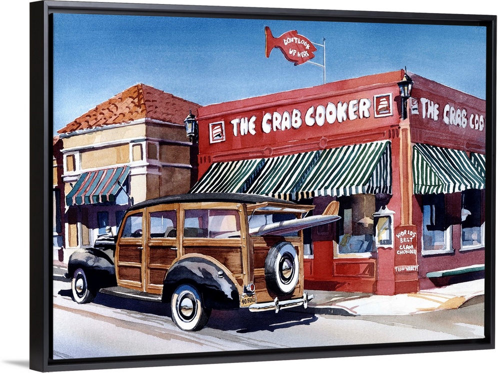 <p>Watercolor of a 1940 Ford woodie surf wagon in front of the Crab Cooker in Newport Beach, CA, Woodie California.</p>