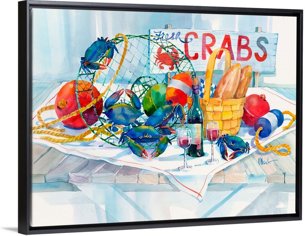 <p>Seafood still life arrangement of crabs, buoys, nets, bread, and wine.</p>