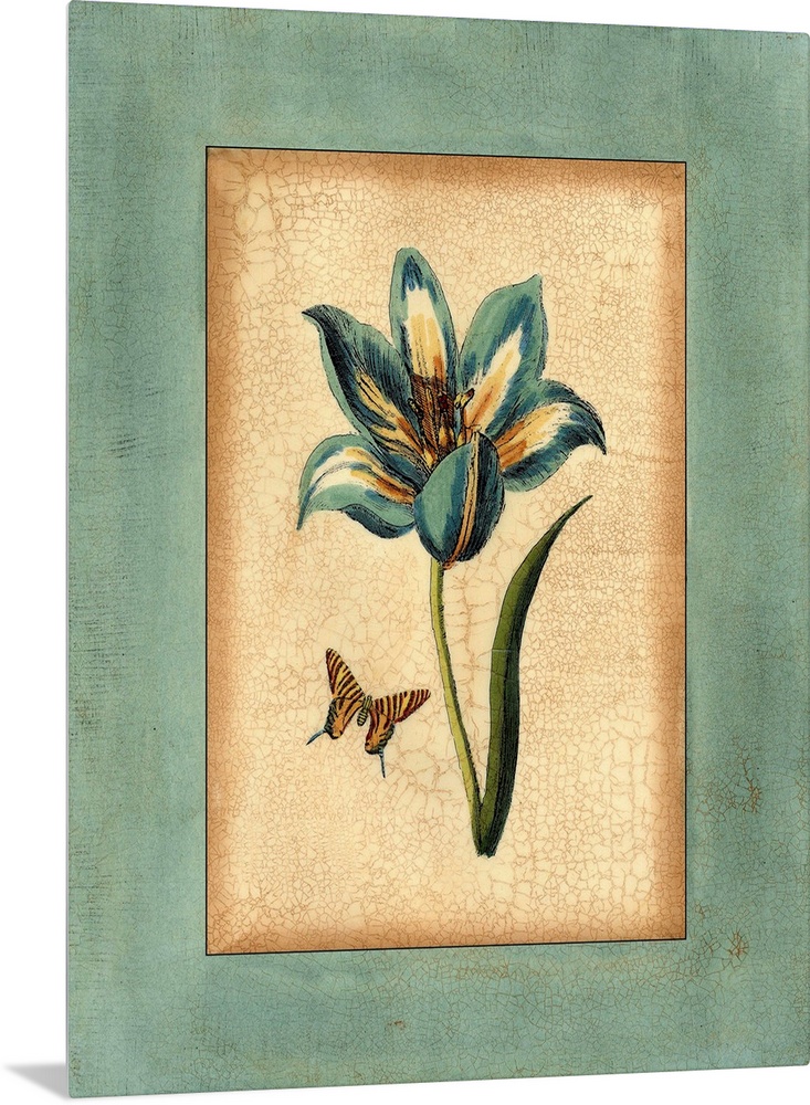<p>Contemporary artwork of a blue tulip with a butterfly in a vintage illustrative style.</p>