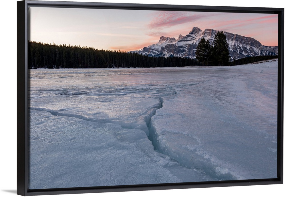 <p>Cracks in ice on frozen lake at sunrise, Mount Rundle, Banff National Park, Alberta, Canada</p>