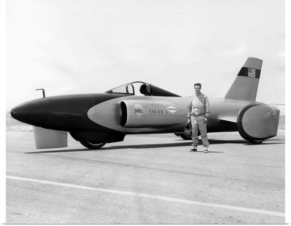 <p>Craig Breedlove stands beside his jet car 'Spirit of America' on the Bonneville Salt Flats in Utah. July 25, 1963. Breedlove set a new land speed record of reached 407.45 mph on Aug. 5, 1963.</p>