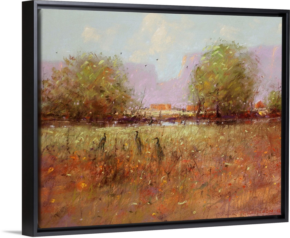 <p>A contemporary painting of a southwestern landscape with birds hiding in tall grass.</p>
