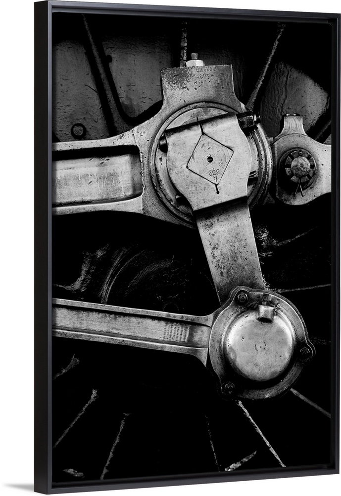 <p>A close up in monochrome black and white of a steam engine main crank wheel.</p>
