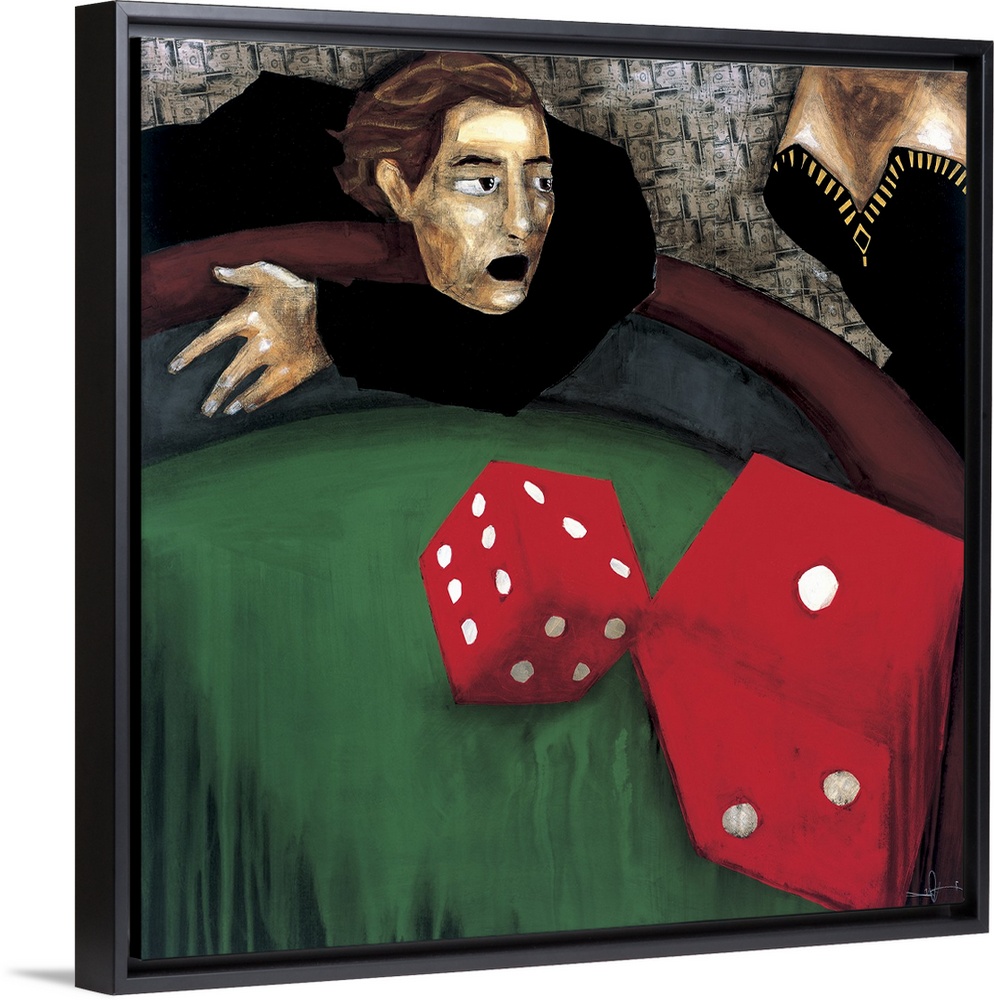 <p>A painting of a man throwing red dice on a craps table.</p>