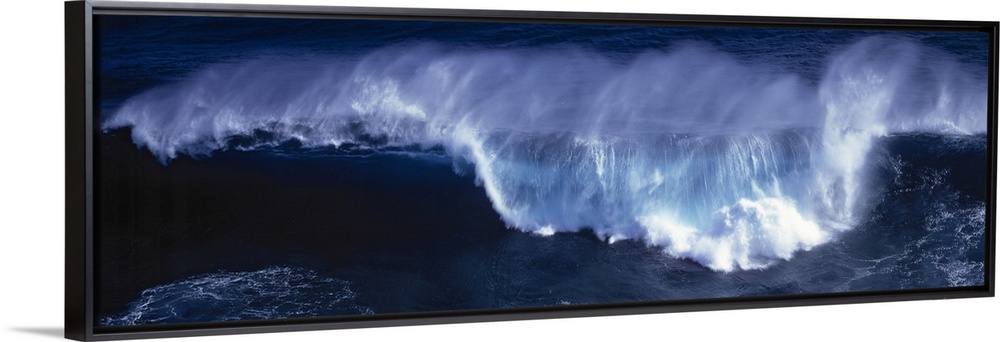 <p>Wide angle shot of a huge wave that has begun to crash down.</p>