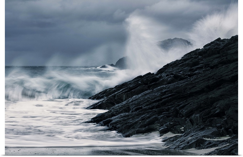 <p>Crashing waves on a stormy Scottish beach with dark rocks under grey sky</p>