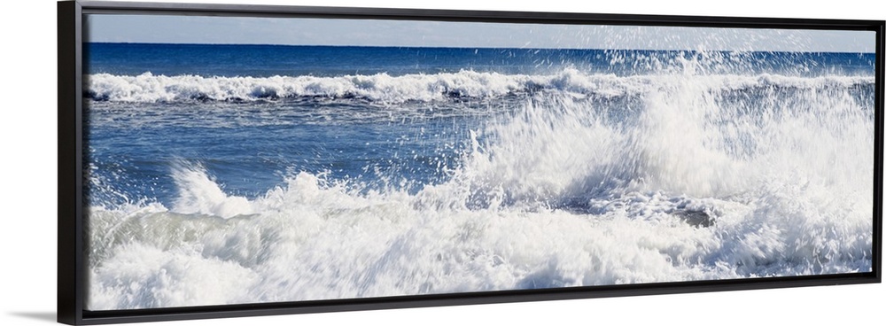 <p>Panoramic photograph displays the Atlantic Ocean furiously breaking onto a sandy shoreline located on an island off the coast of the Northeastern United States. As the waves in the foreground begin to break against the shore, another wave begins to rumble and take shape in the near distance.</p>