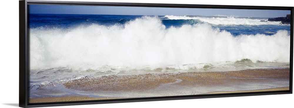 <p>Panoramic photograph of large waves crashing into the beach, bright blue water in the background, in Waimea Bay, Hawaii.</p>