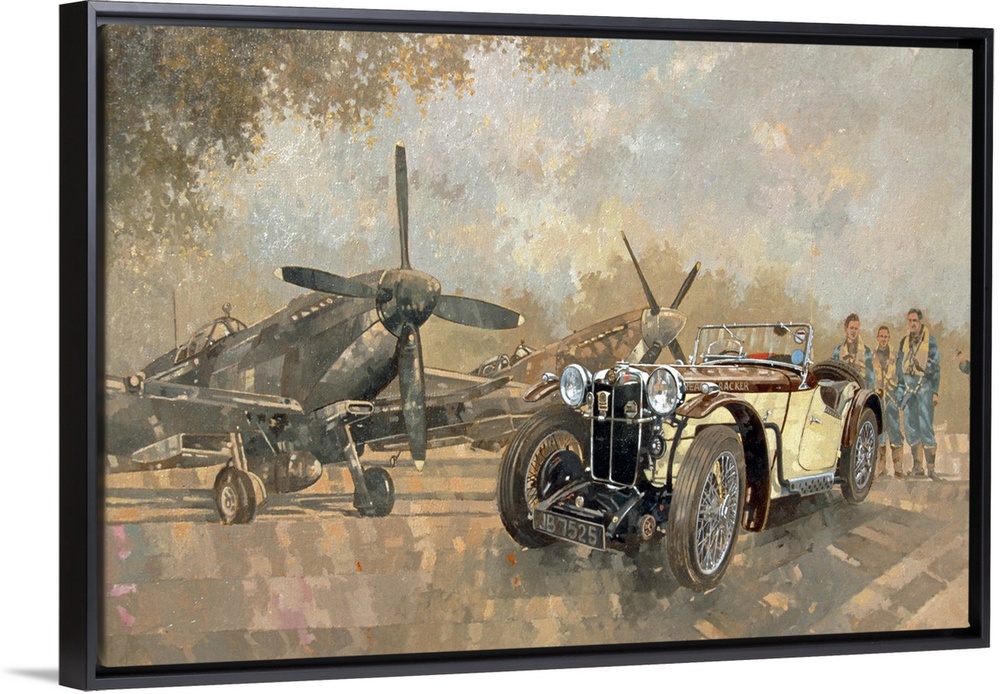 <p>Artwork of a classic car that is parked in front of two military aircrafts as the pilots stand behind and admire the car.</p>