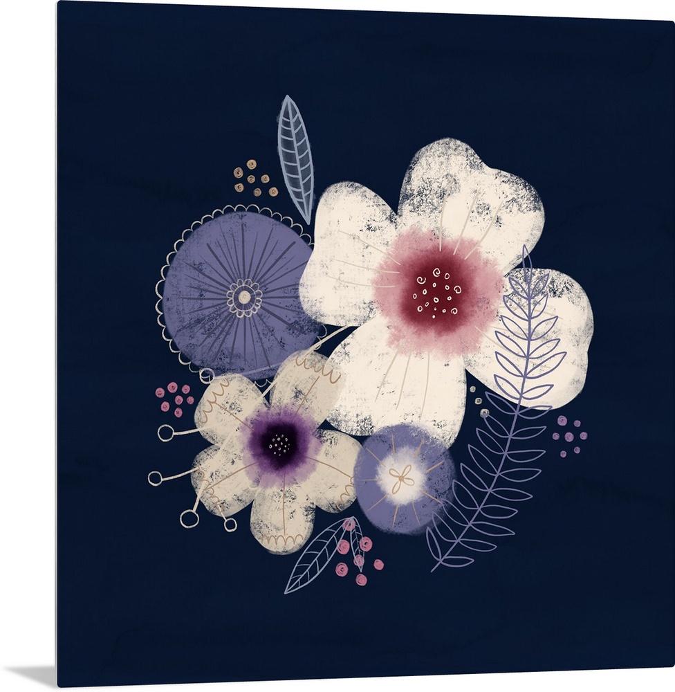 <p>Modern artwork of purple and white flowers on a navy backdrop.</p>
