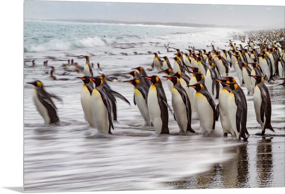 <p>Creative motion blur image of adult king penguins (Aptenodytes patagonicus) returning to the sea on South Georgia, Polar Regions</p>