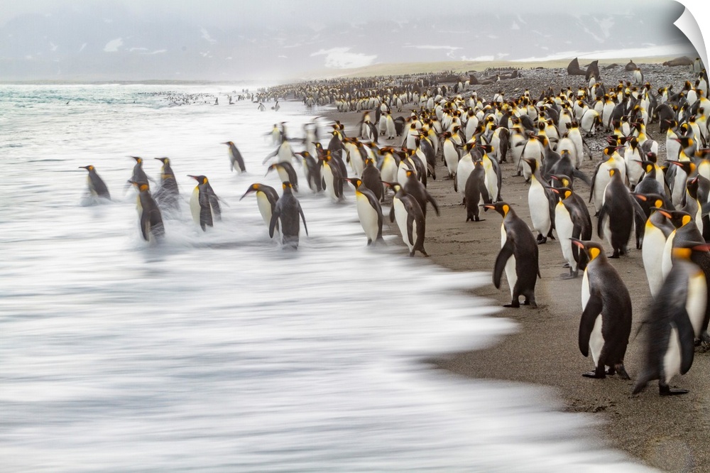<p>Creative motion blur image of adult king penguins (Aptenodytes patagonicus) returning to the sea on South Georgia, Polar Regions</p>