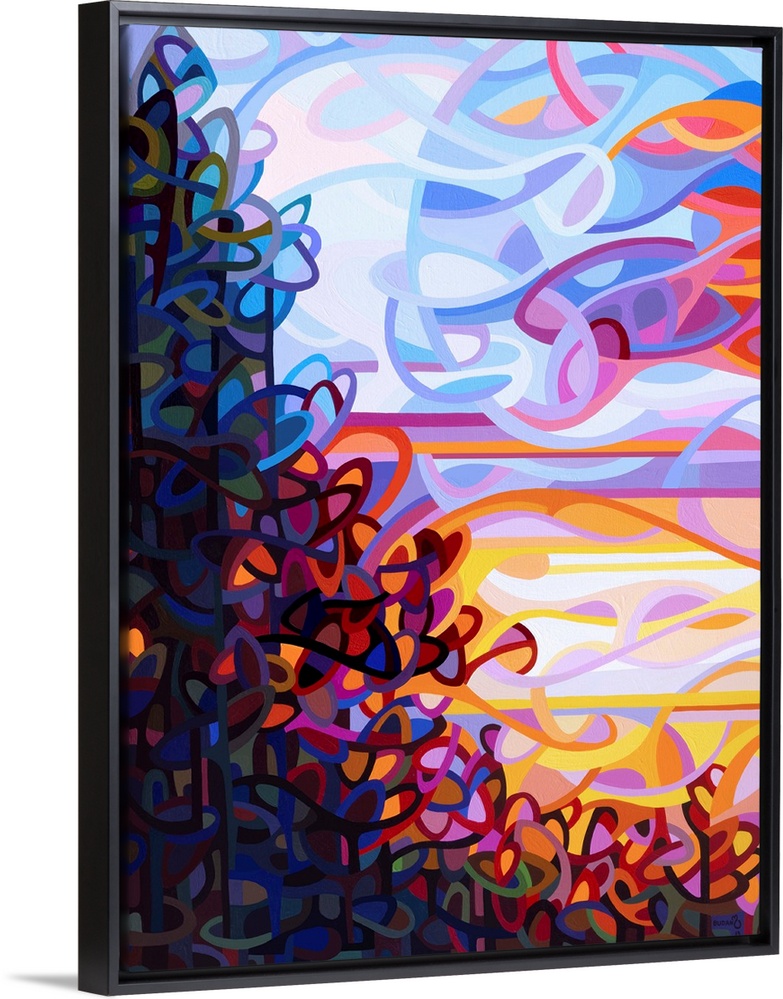 <p>Mandy Budan’s art style is more than unique. Using acrylic colors to weave lines and shapes together like a tapestry, she creates breathtaking images from the simplest forms. Though the multicolored dots of “Standing Room Only” may seem like a scattering of disparate, broken circles up close, a step back reveals a stunning forest scene reminiscent of stained glass. In “Solitaire,” a close examination reveals an intricate collection of interlocking pieces, almost like peeking at the delicate harmony of gears in a pocket watch. Yet again, a step away from the canvas transforms her design into an unrestricted dance of fluid lines and curves in a blossom. Whether it’s the soft floral pinks of “Cascade,” the gold turning crimson in “Stormlight,” or the sweeping blues of “Thaw,” wall art from Mandy Budan adds more than color to a room; it invites visitors to discover something new each time they encounter it.</p>