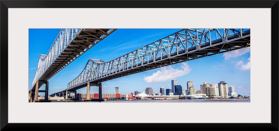 <p>Panoramic photograph of the Crescent City Connection, formerly the Greater New Orleans Bridge, twin cantilever bridges that carry U.S. Highway 90 Business over the Mississippi River in New Orleans, Louisiana, with the New Orleans skyline in the distance.</p>
