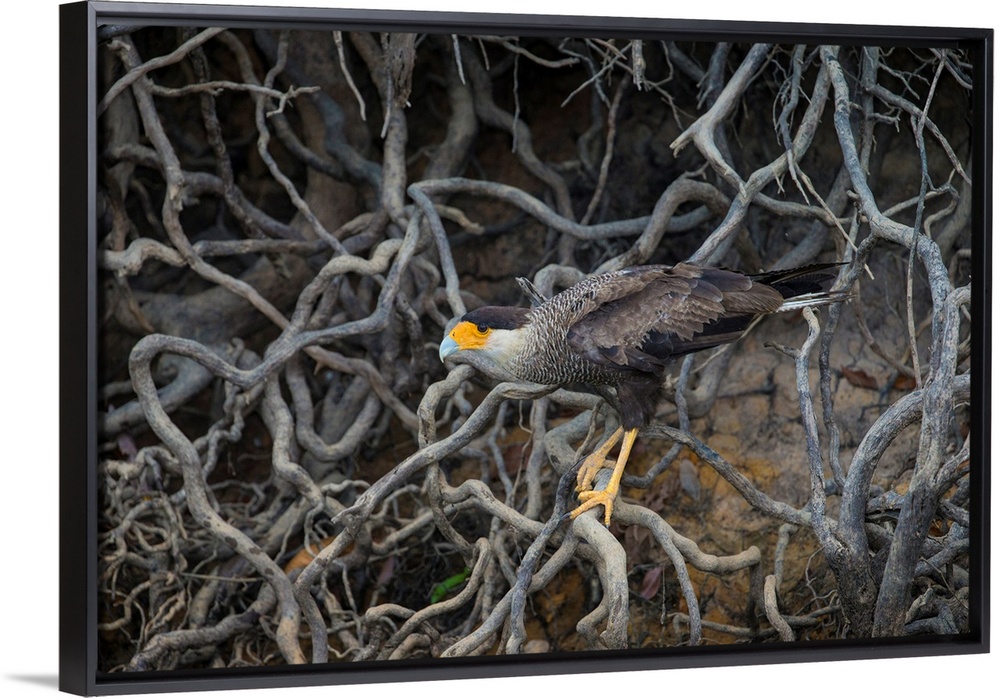 <p>South America. Brazil. Crested Caracara (Caracara plancus) is a raptor related to falcons and shown here fishing along a river's edge in the Pantanal, the world's largest tropical wetland area, and a UNESCO World Heritage Site.</p>