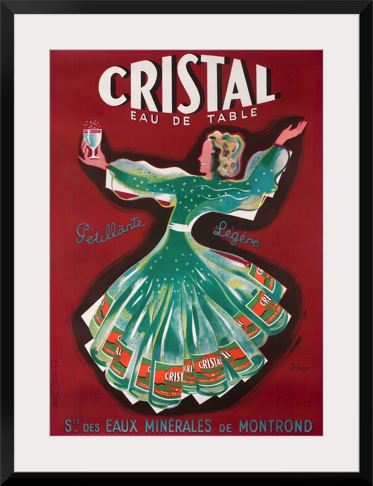 <p>French advertising poster, illustrated by Bellanger, Dancing woman in a dress made of bottled water holds up a glass of Cristal, Eau de Table, Table water.</p>