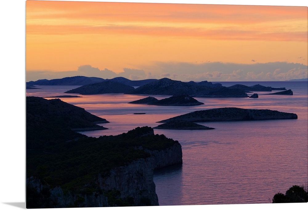 <p>Croatia, Dalmatia, Kornati islands, Dugi Otok island, Mediterranean area, Mediterranean sea, Adriatic Coast, Travel Destination, Telascica Natural Park, Dawn on the cliffs of the Telascica Natural Park from the Grbascak panoramic point and the Kornati National Park in background</p>
