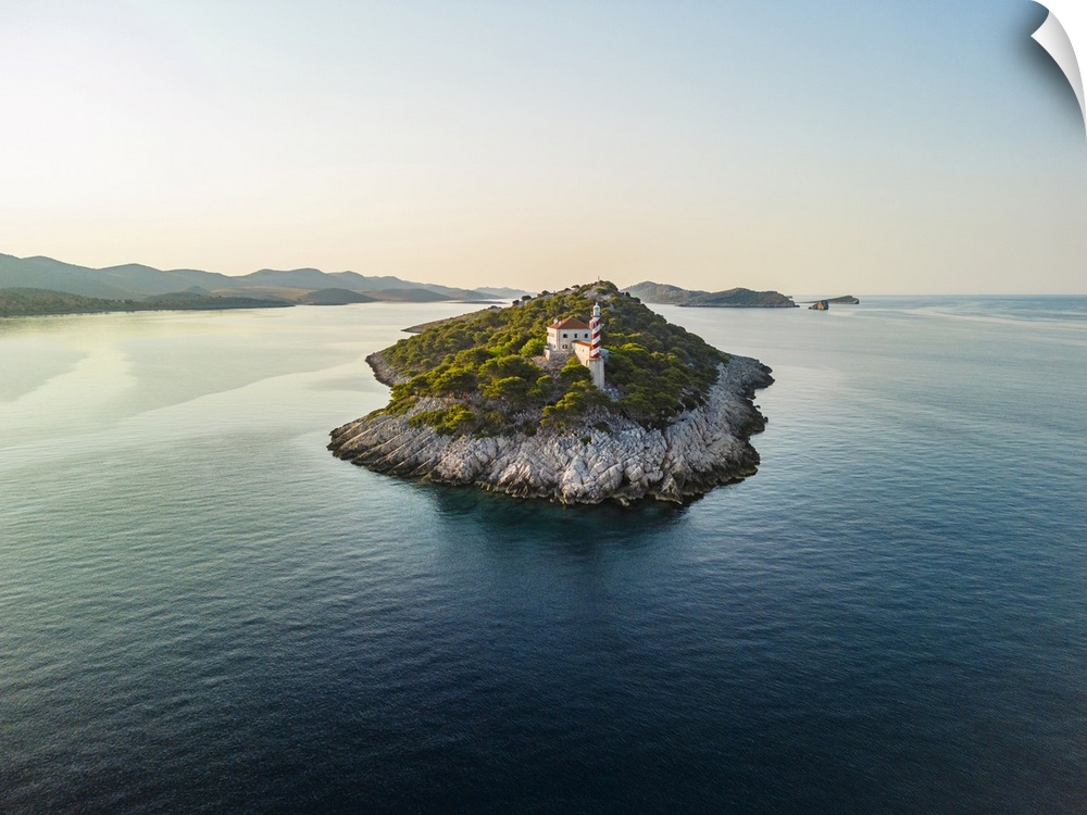 <p>Croatia, Dalmatia, Kornati islands, Mediterranean sea, Adriatic sea, Adriatic Coast, Telascica Nature Park, Aerial view of the Sestrice lighthouse and the island at sunrise.</p>
