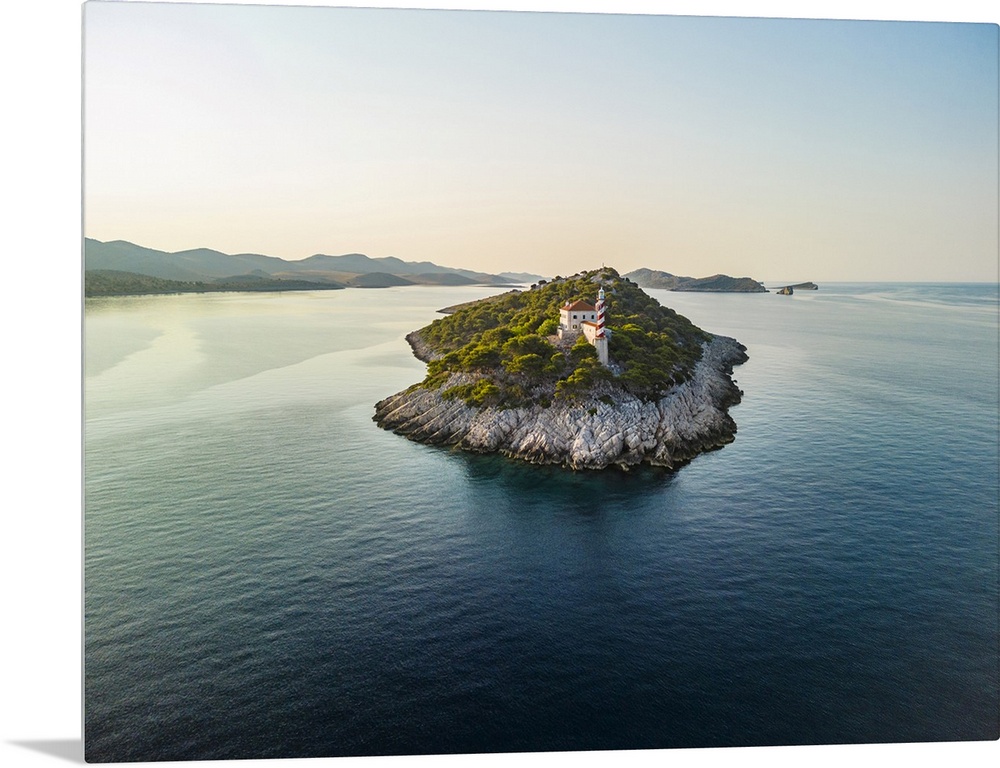 <p>Croatia, Dalmatia, Kornati islands, Mediterranean sea, Adriatic sea, Adriatic Coast, Telascica Nature Park, Aerial view of the Sestrice lighthouse and the island at sunrise.</p>
