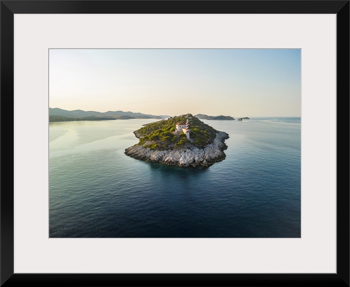 <p>Croatia, Dalmatia, Kornati islands, Mediterranean sea, Adriatic sea, Adriatic Coast, Telascica Nature Park, Aerial view of the Sestrice lighthouse and the island at sunrise.</p>