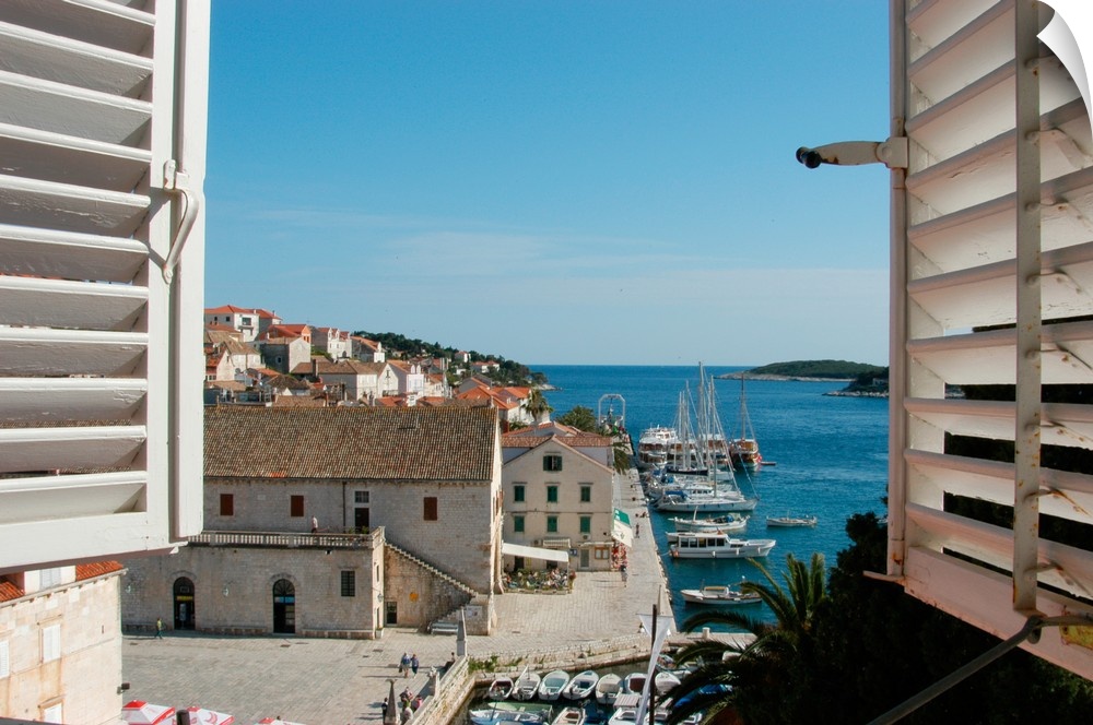 <p>Croatia, Dalmatian Coast, Hvar, view of the harbor, boats and Riva seen thru shuttered windows of Palace Hotel</p>