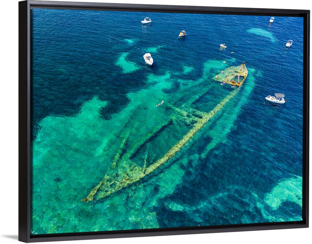 <p>Croatia, Dalmatia, Kornati islands, Dugi Otok island, Mediterranean sea, Adriatic sea, Adriatic Coast, Boats near the wreck of a cargo sunk in the clear waters of Veli Rat.</p>