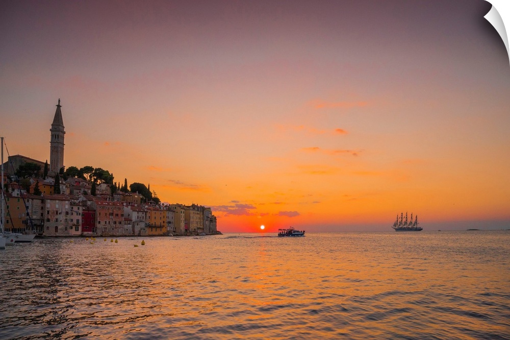 <p>Croatia, Istria, Adriatic sea, Adriatic Coast, Mediterranean sea, Rovinj, Sailing ship and historical centre at sunset.</p>