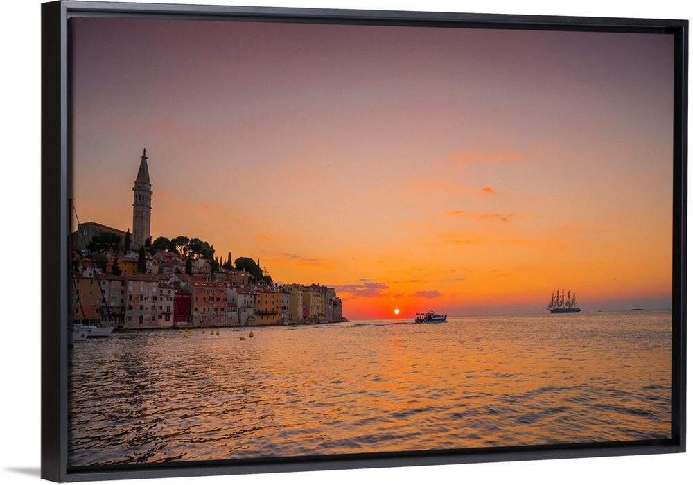 <p>Croatia, Istria, Adriatic sea, Adriatic Coast, Mediterranean sea, Rovinj, Sailing ship and historical centre at sunset.</p>