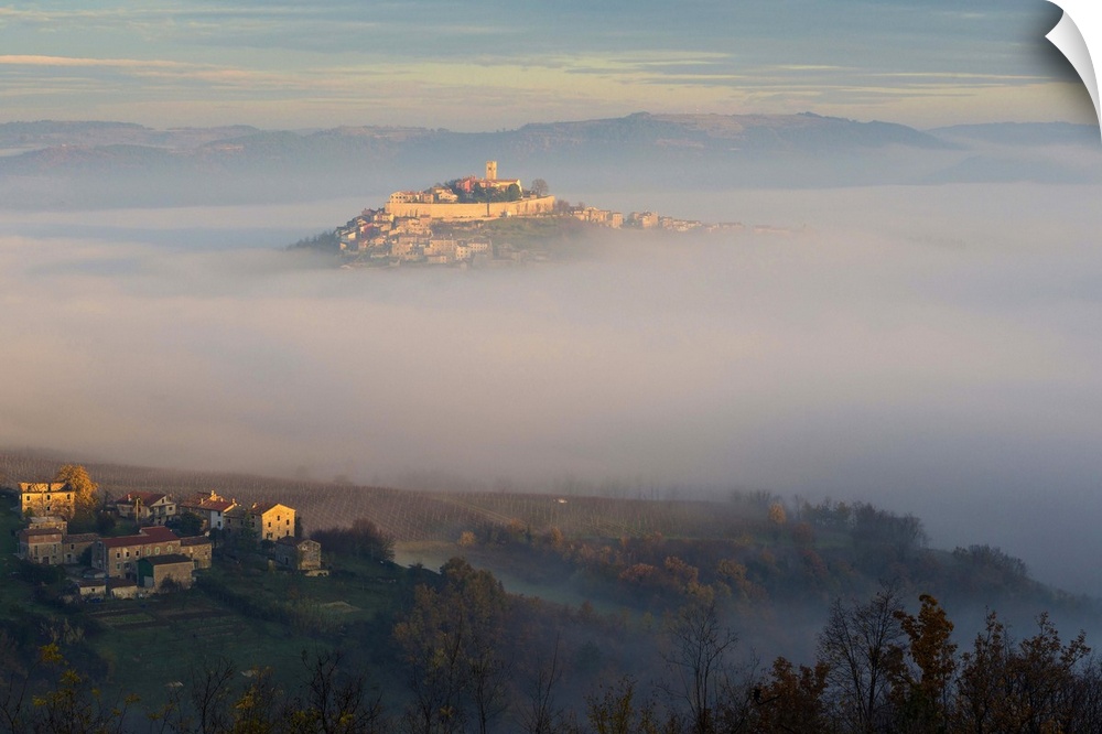 <p>Croatia, Istria, Motovun, Village emerging from the mist at dawn.</p>