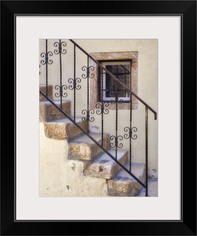 <p>Croatia, Rovinj, Istria. Stairs and wrought iron railing leading to a home.</p>