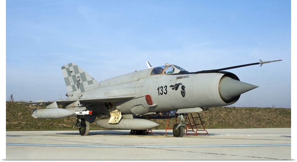 <p>Croatian MiG-21bis seen during the Open Day in Pleso for the 25th anniversary of the Air Force, Zagreb-Pleso Airport, Croatia.</p>