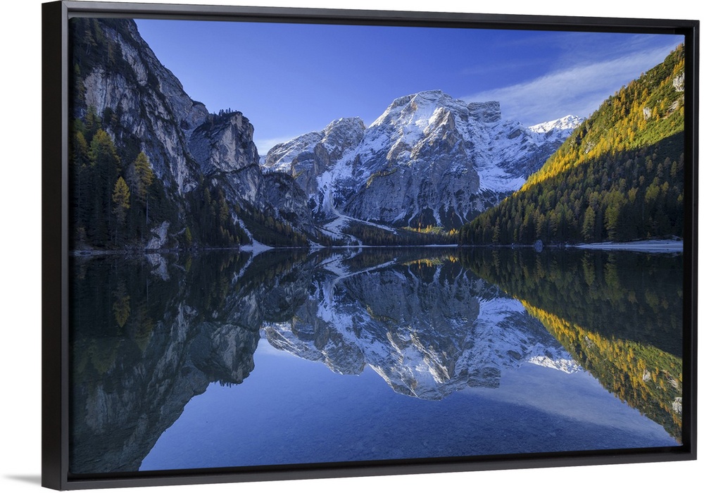 <p>Croda del Becco (Seekofel) reflected in Braies Lake in autumn, Prags Dolomites, South Tyrol, (Bozen Province) Trentino Alto Adige, Italy</p>