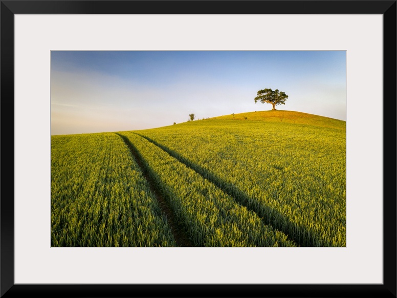 <p>Crop field and lone hill top tree, Devon, England. Spring (May) 2020.</p>