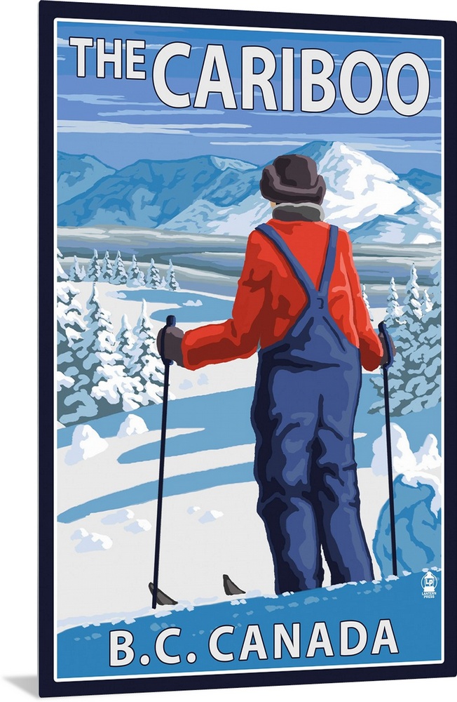 <p>Retro stylized art poster of a skier stopped and gazing out over a snowy mountainous landscape.</p>