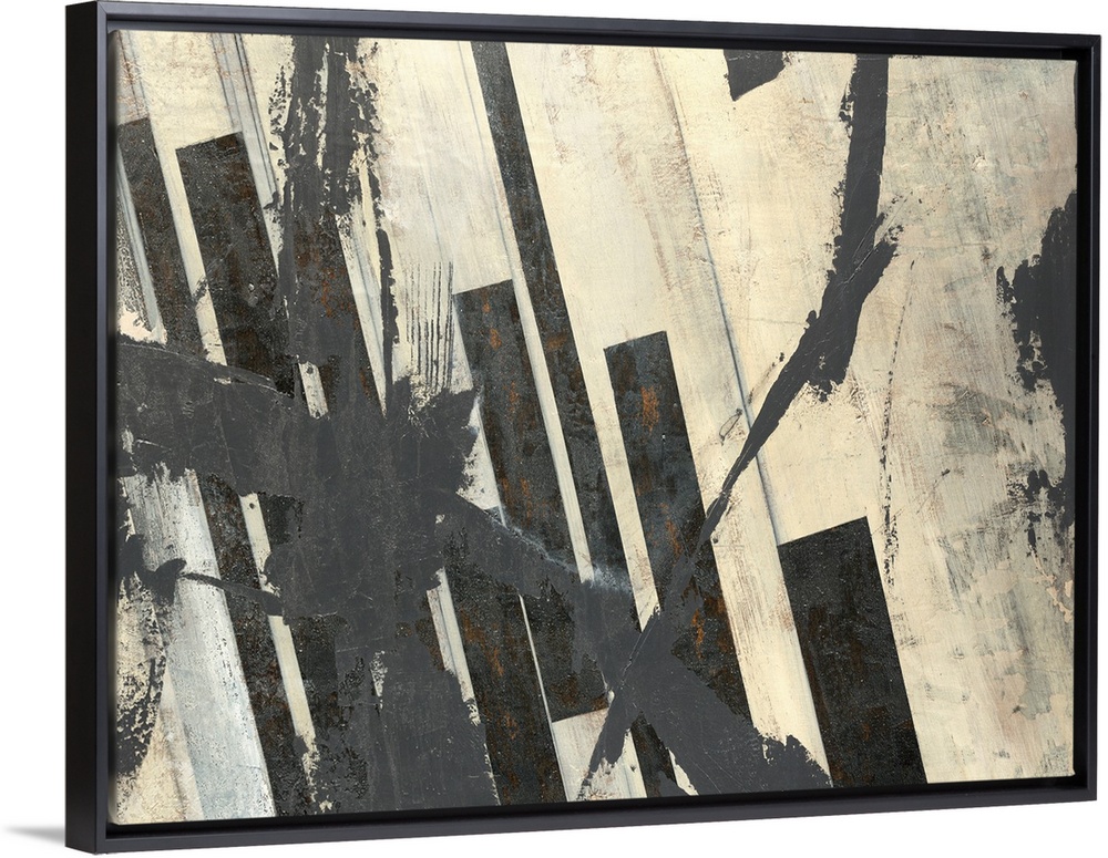 <p>Abstract artwork with splashes of black paint on an off white background with thick black bars also going diagonally on the print.</p>