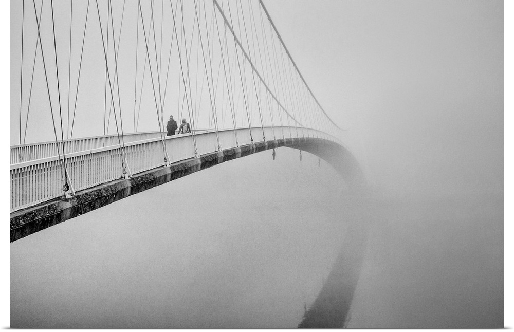 <p>Two people crossing a pedestrian suspension bridge in the winter.</p>